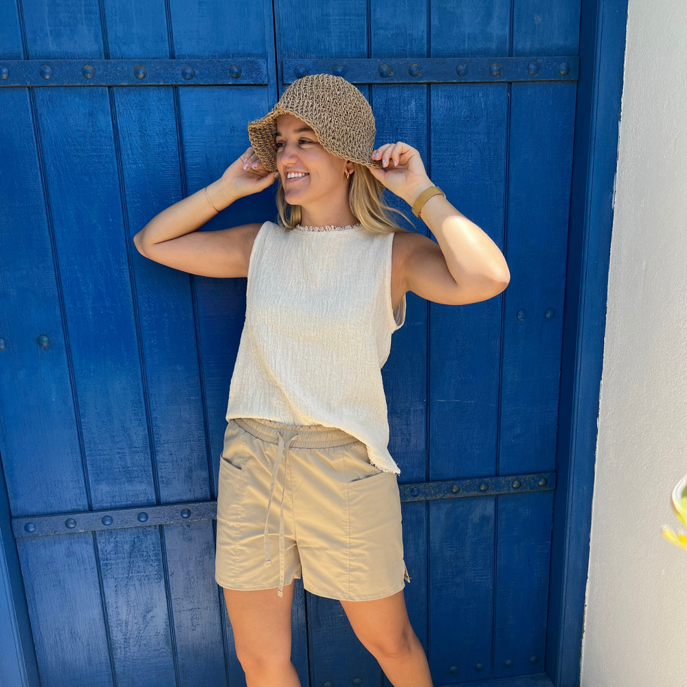 Bermuda shorts made of cotton poplin. Featuring design cutouts on the front and back, built-in front pockets, and an elastic waistband with adjustable locks.