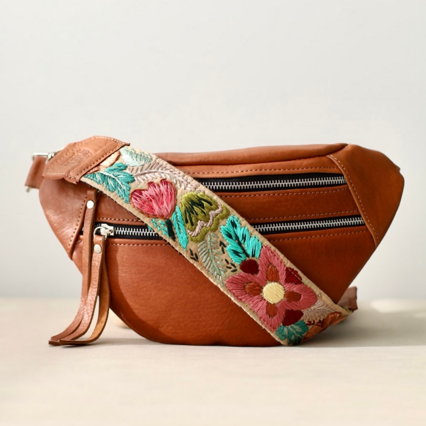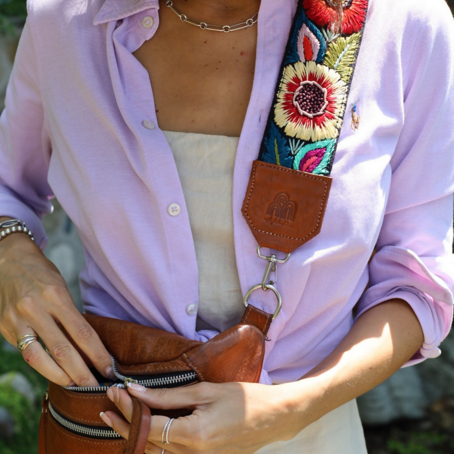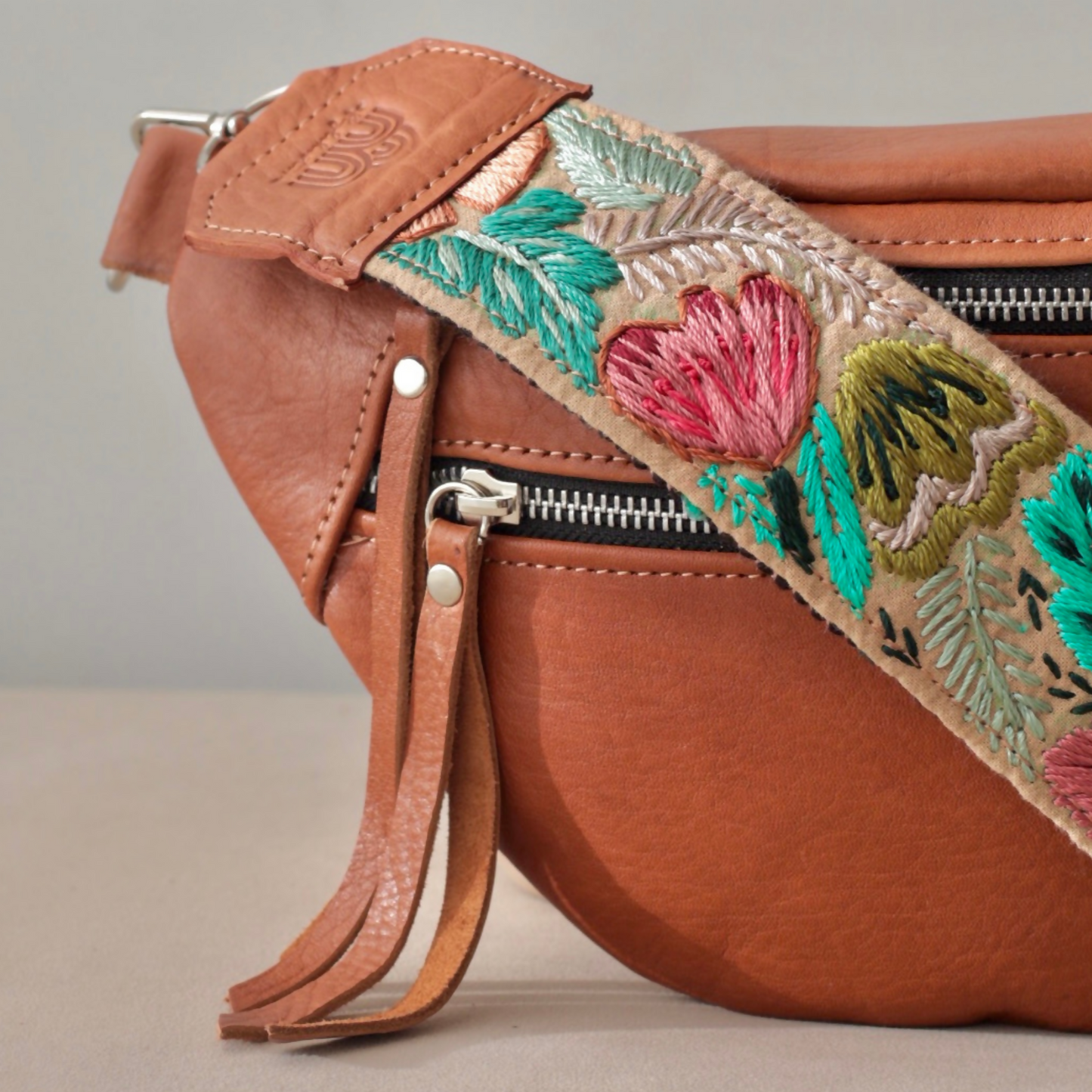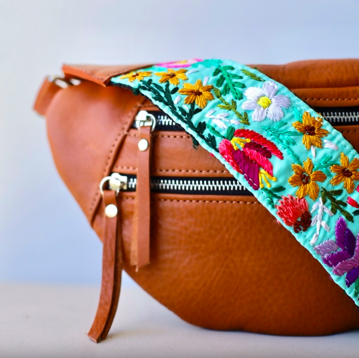 Our Emma Sling Bag perfect to carry your passport, wallet and phone when travelling! Combined with our colorful hand-embroidered straps from Guatemala that are made by hands that are worth gold! Each sling bag is handcrafted with our premium vegetal tanned leather made in Argentina since 1956, backed by the Good Argentine Design Seal, a recognition of excellence in national design and production. (Sello Buen Diseño Argentino)