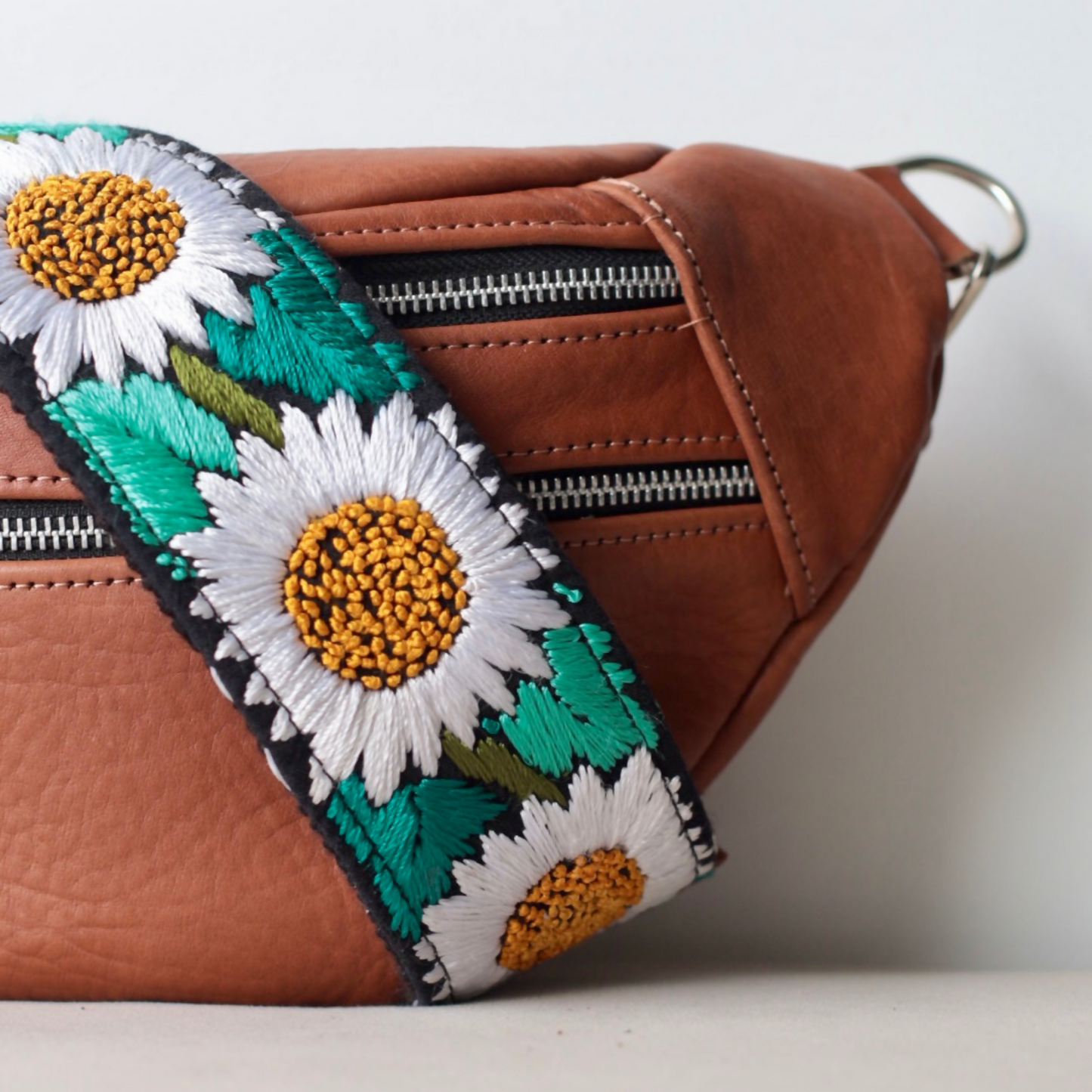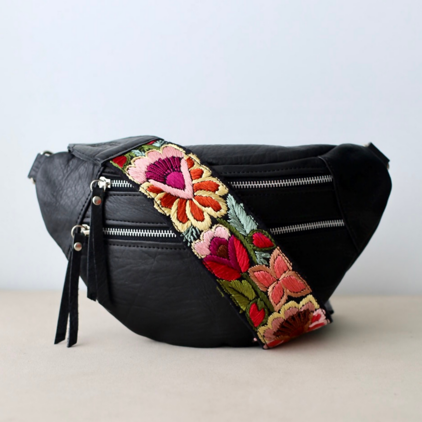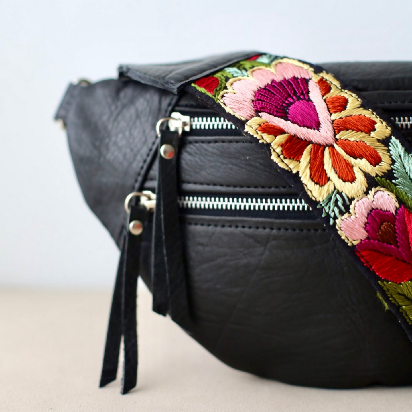 Our Emma Sling Bag perfect to carry your passport, wallet and phone when travelling! Combined with our colorful hand-embroidered straps from Guatemala that are made by hands that are worth gold! Each sling bag is handcrafted with our premium vegetal tanned leather made in Argentina since 1956, backed by the Good Argentine Design Seal, a recognition of excellence in national design and production. (Sello Buen Diseño Argentino)