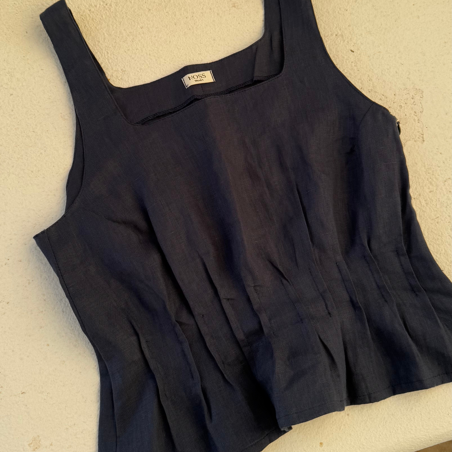 Tank top with a square neckline and gathers under the bust all the way around. It features an invisible zipper on the side for easy on and off.