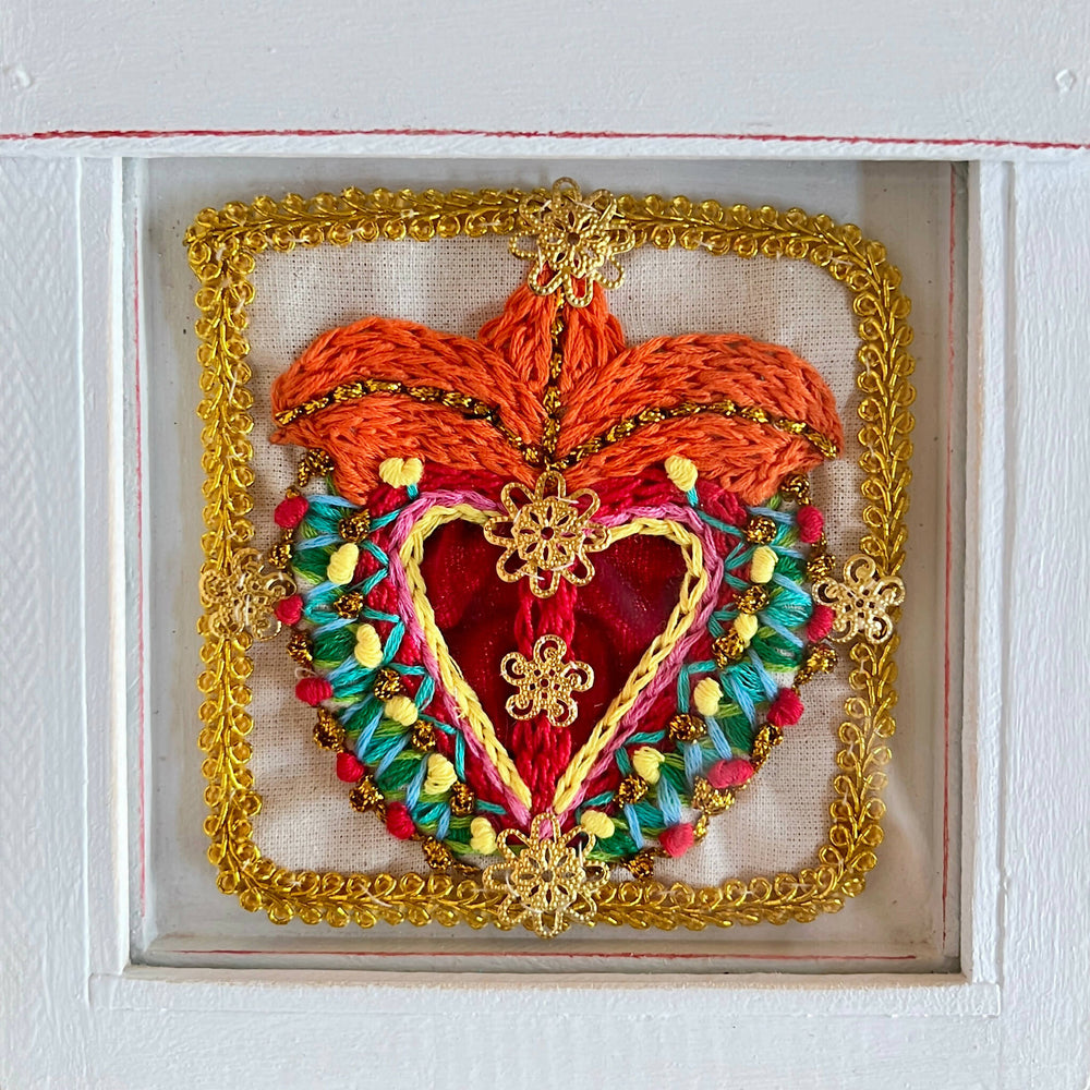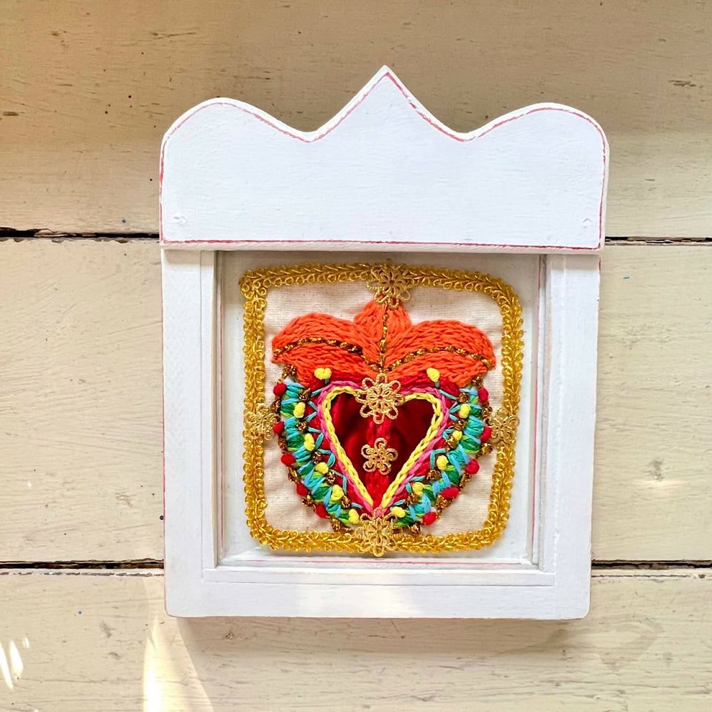 Manufactured completely by hand, from the carpentry of the altarpiece to the embroidery inside, it is for this reason that each piece is unique and never identical to another.In a slow production process and full of details, which is why its production is exclusively in very limited quantities. The Chilean artist and artisan Rocío Inostroza, creator of these altarpieces, rescues an ancient tradition full of beauty and meaning, where women embroidered a Heart of Jesus, as a protection amulet for their loved ones, a custom that belongs to the beliefs and popular arts of their country and their own family history.