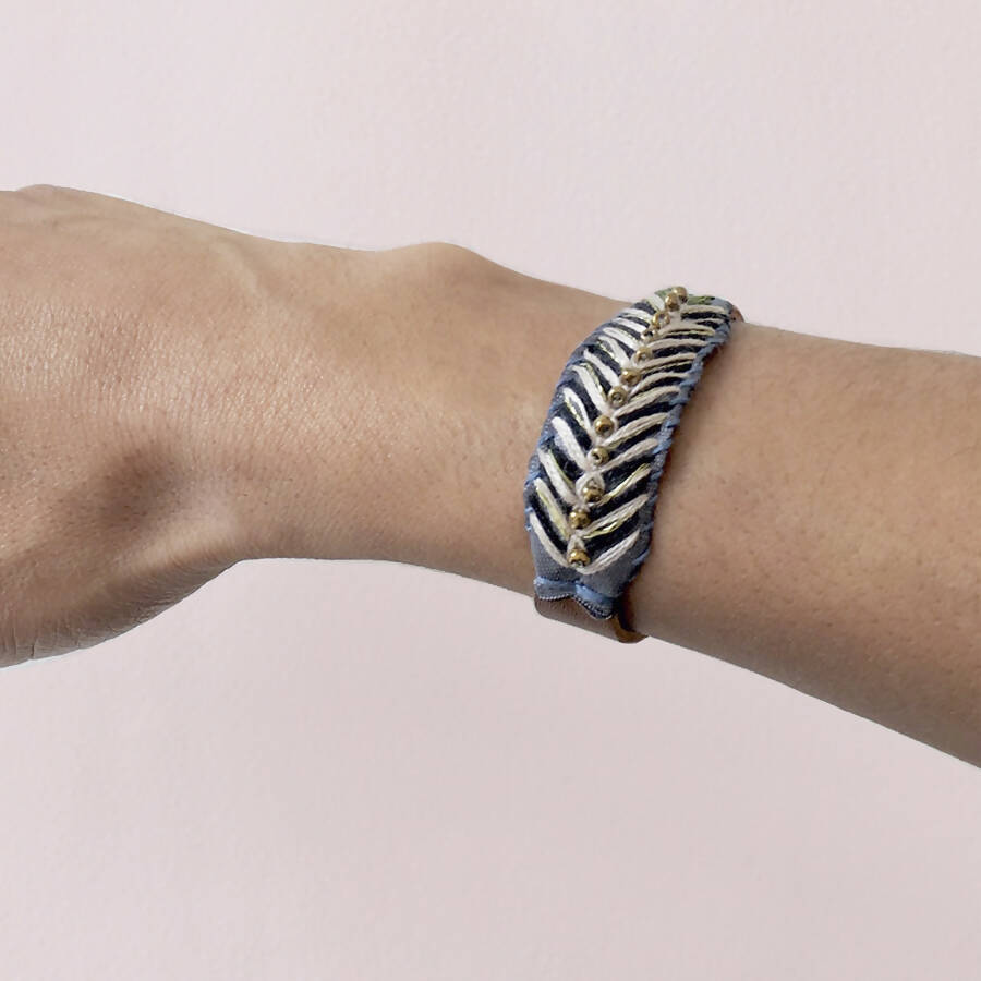 Hand-embroidered bracelet with cotton thread in black, beige and golden metallic thread, on gray ribbon and brown vinyl. Adjustable black cord clasp.